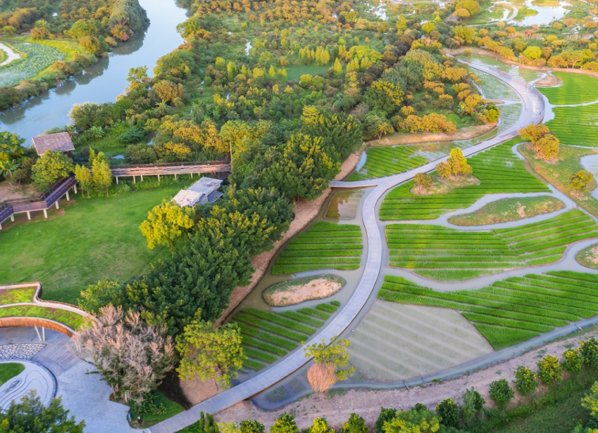 🌳主要树种或康养植物品种:龙眼、荔枝、黄皮等岭南果树,广州樱、无忧树、火焰树、木棉、榕树等乔木,水稻、莲、睡莲等水生植物。