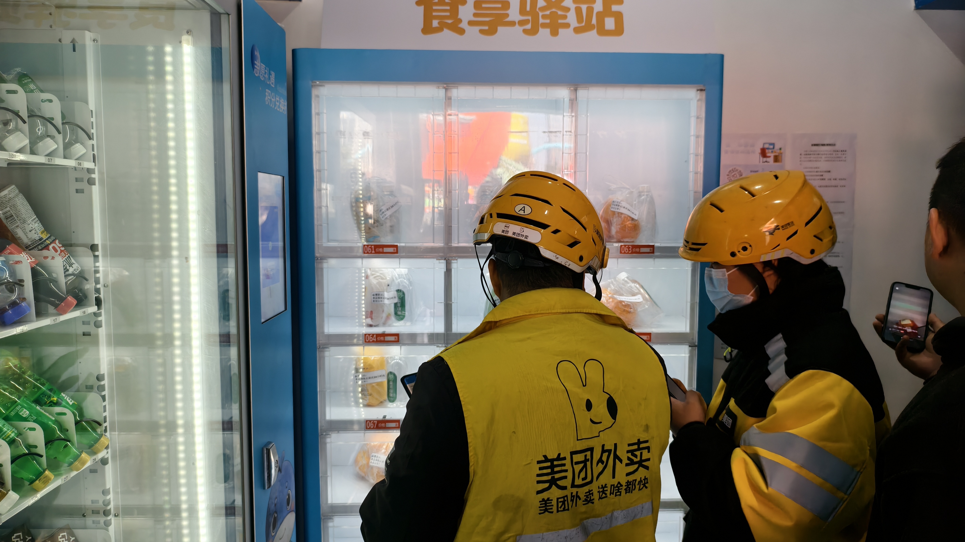 当天下午,第一批物资装柜不久,记者在现场看到,不少外卖骑手陆续赶来兑换,半小时内柜内物资所剩无几。