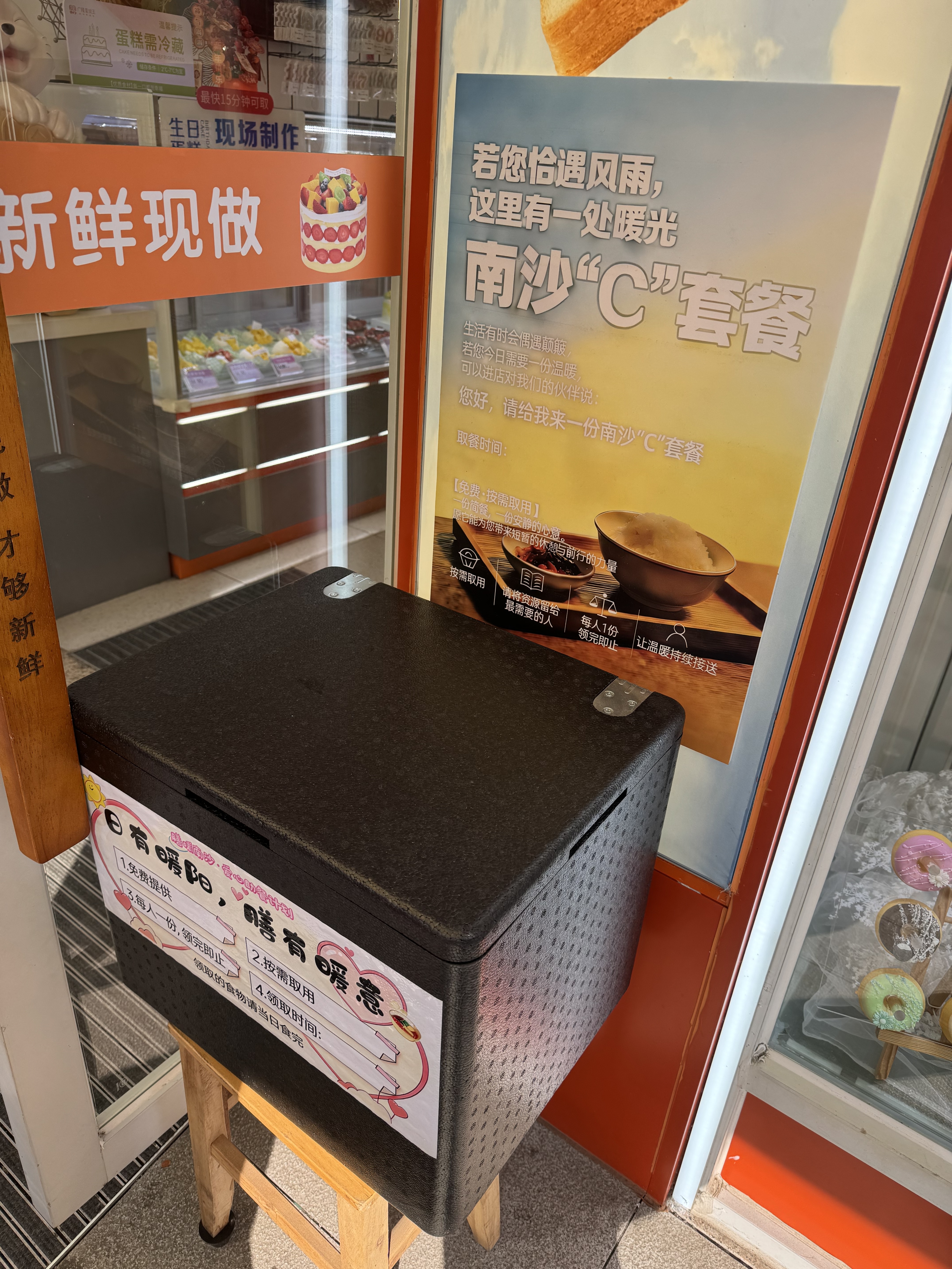 柜内物资全部来自企业无偿捐赠——农夫山泉的橙子、本地烘焙品牌“CakeCakeMore本心烘焙”的面包、广州市泉芯饮用水有限公司提供的矿泉水……每一份物资背后,都是一份社会爱心的接力。